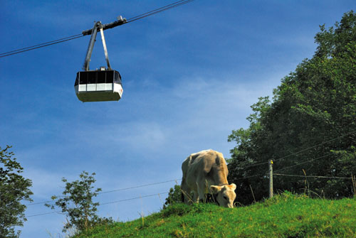 שני סמלים שוויצריים טיפוסיים: פרה רועה באחו ורכבל מטפס לראש ההר |