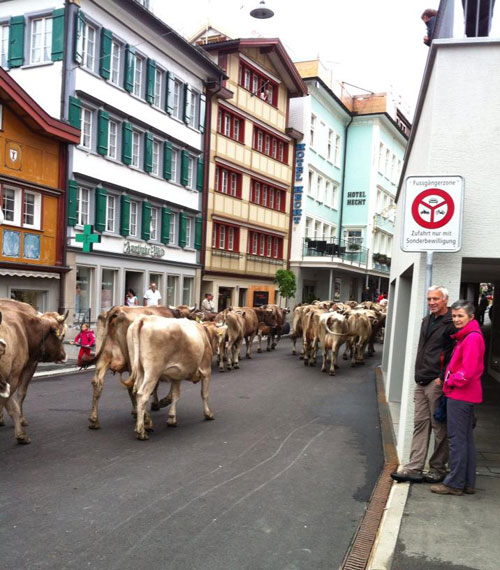 בשלב מסוים נפרדו דרכנו ואנחנו המשכו למחוזות אחרים. חזרנו לאפנצל בדיוק בזמן כדי לשוב ולהיפגש עם הפרות, שצעדו כעת בגאון במרכזו של רחוב הראשי מוקפות בתושבים אוהבים שעמדו על המדרכות והריעו להן ולרועים שהובילו אותן. מילה רעה לא נשמעה גם כששתי פרות לא התאפקו ועשו את מה שעשו באמצע הרחוב, ממש מול הכנסייה.