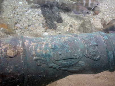 תותח ברונזה עם חותם של המלך ג'ורג' הראשון (1727-1714), נמצא במקום בו טבעה הספינה הבריטית ויקטוריה | הצילום באדיבות חברת אודיסאה