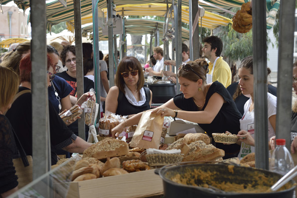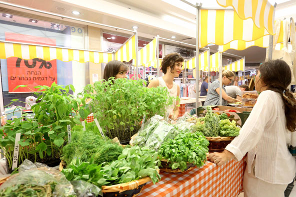.jpg) דוכן פרחים בשוק האיכרים בנמל | צילום: דוד סרנגה, פליקר שוקיסטה, שוק איכרים בדיזנגוף סנטר, תל אביב דיזנגוף סנטר הוא אולי אחד המקומות האחרונים שעולים בדעתכם כשאתם חושבים על תוצרת חקלאית טריה, אבל גם הקניון העירוני הגדול מתהדר בשוק איכרים משלו. ייחודו של השוק הזה, שמתקיים בכל יום חמישי אחר הצהרים, בכך שחלק מהמגדלים מוכרים כאן בפעם הראשונה לקהל הפרטי תוצרת שעד כה היה אפשר להשיג רק במסעדות גורמה, כמו עשבי התיבול והירקות המיוחדים של משק עלה עלה או האספרגוס של יוכי אספרגוס. אפשר למצוא בשוק הזה גם את גבינות העיזים האורגניות של משק עפאים, את האננס והפיטאיה של HolyPine מבית יצחק, את הלחמים המשובחים של אדון שיפון ועוד.  דוכן פירות וירקות טריים בשוקיסטה בדיזנגוף סנטר צילום: פוטוליה מתי? בכל יום חמישי בשעות 20:00-14:00 איפה? בניין A, קומה 1, דיזינגוף סנטר, תל אביב מנטה מרקט, תל אביב והוד השרון זהו לא שוק איכרים קלאסי כי אם שוק בריאות שמציע, לצד תוצרת חקלאית טרייה, גם מאכלים מבושלים ומוכנים לקחת הביתה והרבה מוצרי בריאות כמו צמחי מרפא, מוצרי קוסמטיקה טבעית, מוצרים אקולוגיים ועוד. השוק החל את דרכו במתחם התחנה בתל אביב, ומהר מאוד הפך להיות שוק צמחוני/טבעוני, מה שאומר שבנוסף לירקות, פירות, לחמים, ממרחים, שמן זית, מיצים סחוטים ועוד, תמצאו בו גם דוכנים של אוכל טבעוני מוכן, גבינות טבעוניות, רואו פוד ועוד.  דוכן לחם במנטה מרקט תל אביב, במתחם התחנה | צילום: יונתן בלום מעניינים במיוחד הדוכנים של האוכל הטבעוני המוכן שכוללים המבורגרים ונקניקיות מסייטן ומסויה, אוכל הודי, אוכל אתיופי, קישים טבעוניים ועוד. בין הדוכנים בשוק תמצאו את הירקות והפירות האורגניים של משק עלי"ל מקיבוץ ניצנים, עשבי התיבול של תבליני ניצן ממושב נעמה, מוצרים אורגניים (ריבות, שמן זית, ליקרים וגבינות) של נאות סמדר ועוד. לצד החוויה הקולינרית אפשר ליהנות כאן גם מעיסויים וטיפולים אלטרנטיביים, שיעורי יוגה, סדנאות בישול טבעוני ועוד.  דוכן ירקות במנטה מרקט שרונים בהוד השרון | צילום: יונתן בלום מתי? בכל יום שישי, למעט ימים גשומים, בשעות 15:00-9:00 איפה? במתחם התחנה, רחוב קויפמן פינת רחוב המרד, תל אביב-יפו