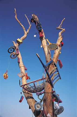 בגן השעשועים של הקיבוץ אפשר לטפס על פאף הדרקון, שקרביו מלאים צמיגים ישנים, בקבוקי זכוכית ופלסטיק, צינורות השקיה שבורים, פחיות ריקות ועוד. עורו הצבוע ירוק של הדרקון עשוי מתערובת של אדמת לס מקומית, חול, מים ונייר ממוחזר, בעיקר עיתונים וניירת משרדית, והוא נראה נפלא. לידו שוכנת מורלה, הצבה הענקית מהספר "הסיפור שאינו נגמר", שעשויה גם היא מתערובת חומרים דומה, ועיניה הן תחתיות בולטות של בקבוקי בירה ירוקים. לידם שטה "תיבת נח" ויש גם תיאטרון בובות קטן, והכל עשוי מחומרי פסולת ממוחזרים, צבעוניים ומקושטים. ליד היצורים והבובות יש "חלון אמת", המדגים מה מסתתר מתחת לעיסת הנייר והחול הצבועה שממנה הם עשויים: צמיג מלא פחיות, בקבוקים ופסולת, שאלמלא מצאו את מקומם כמילוי לדרקון, לצב ולתיבת נח, היו מושלכים כלאחר כבוד אל המזבלה הסמוכה. "מאז שהתחלנו למחזר, ירדה כמות הזבל בשני שלישים", מספר שלמה כהן, מהמתנדבים הבולטים במקום. "פסולת המטבח הולכת לקומפוסט, ופסולת בקבוקים, פחיות ופלסטיק – לבנייה אלטרנטיבית". בלוטן צריכים להתמודד, בין היתר, עם אקלים מדברי יבש, וזה אומר בעיקר שמש קופחת, שורפת ומייבשת. אחת הדרכים להתמודד עם הקושי הזה היא חיפוי הקרקע, כדי לשמר את הלחות באדמה לאחר ההשקיה. הפתרון האקולוגי – והחסכוני להפליא – שהם מצאו הוא שימוש בגזם גינות לכיסוי האדמה. על שדה קטן בשולי הקיבוץ ניצבת "הערמה של גזמוני" (Pruny’s Pile), ולידה שלט הסבר: "הערמה שלי ממשיכה לתפוח בקצב הגידול של גינות הקיבוץ. העצים זקוקים לגיזום באופן שגרתי, וכל הגזם מוצא את דרכו לכאן. בעצם הוא עובר קודם במכונה שחותכת אותו לחתיכות קטנות והופכת אותו לחומר חיפוי, אבל אל תגלו לו. הגזם יודע רק שתפקידו יהיה להגן על שורשי עצים, לחסוך במים ולשפר את איכות הקרקע".