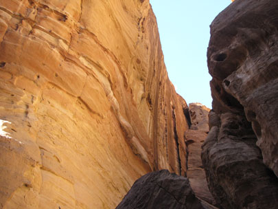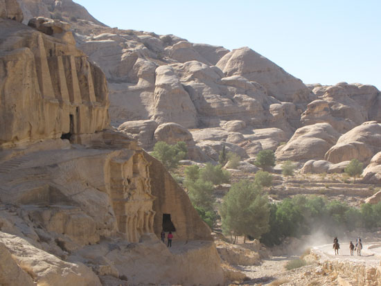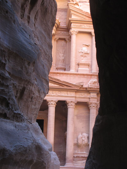 ההגעה לעיר פטרה פתאומית. העיר נחבאת מעין המתבונן, ולפתע נגלית באמצע שום מקום – in the middle of nowhere כפי שאמרו בני המשפחה האמריקאים. עשינו דרכנו בוואדי מוסא, כשמראות בראשית מקיפים אותנו מכל עבר. אבני החול שינו את צבען עם התקדמות השמש ברקיע. מוחמד הסביר כי אנו נמצאים בתחילת קניון סיק, שרוחבו מטרים ספורים, אבל התחושה היא שהקירות סוגרים עלינו. למרות החום הכבד וההצעות שמגיעות מכל עבר לרכוב על גמלים, סוסים או בכרכרות, אנחנו ממשיכים ברגל. אני נזכר שקברו של אהרון הכהן, אחי משה רבנו, נמצא בקרבת מקום וחושב שכנראה לא רחוק מכאן עברו בני ישראל בדרכם לכיבוש ארץ כנען.