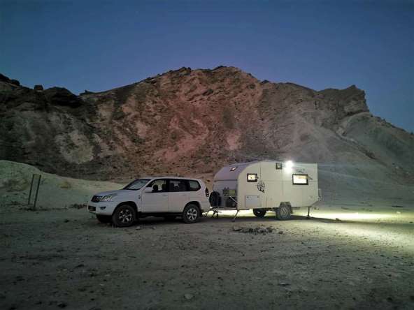 פעם הגדרתי בצורה מסובכת את אזור מיצרי הפארן כך: אם הייתי מגיע לנוף כזה בנמיביה הייתי אומר שרק בשביל הנוף הזה היה שווה לנסוע עד לשם… הבנתם? לא ממש. בכל אופן הנוף מדהים. אלא שהנסיעה המדשדשת באפיק ואדי ציחור היתה מאתגרת. הרכב התחפר באפיק ונאלצתי להגביר מהירות כל הזמן כדי להיחלץ משקיעה. הבנתי שמה שעושה ג'יפ לבדו, הוא לא יוכל לעשות עם קרוואן נגרר. הג'יפ שוקל 2 וחצי טון ויש לו כוח ועבירות גבוהה. תוסיף לו עוד 2 טון משקל בלי תוספת מנוע, והוא בקושי מחלץ את עצמו. הבנתי שאני צריך לשנות הרגלים. הרכב עם הקרוואן יכולים אמנם להיכנס לדרכי עפר אבל רק לטובות ולא מאתגרות. אני צריך לבחור מראש אתר אפשרי ולהחנות שם את הקרוואן. זה יהיה מחנה הבסיס בו אנתק את הקרוואן מהג'יפ, ומשם אצא לטיולי ג'יפים וטיולים רגליים, ואשוב למקום מידי ערב או אפילו אסע ליומיים ואשוב. פשוט לטייל אחרת.