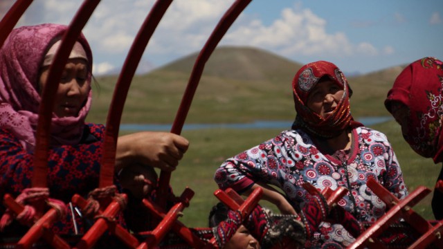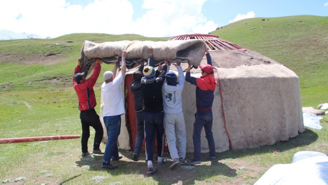 התמזל מזלנו וביום השני הגיע משפחה לאגם לבנות יורט לעבור אליו לחודשי הקיץ. עזרנו בבניית היורט ועקבנו אחרי שלבי הבנייה.