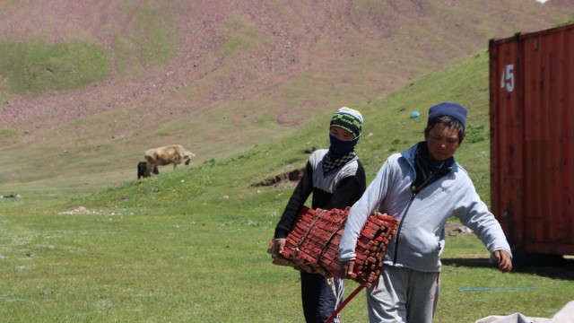 בזמן שהקמנו את האוהל הגיע מקומי שיכור, נאחז בשתי נכדותיו בשביל לשמור על שיווי משקל. "דבאי, צ'אי". הוא צחק. "בערב שותים, ביום עובדים. אלו החיים". הוא לא הותיר לנו הרבה ברירות. ביורט היפה שלהם הגישה לנו אישתו חלאב, קומוס (חלב סוסה, המשקה המקומי אליו מייחסים תכונות מרפא) וכפיר, מין יוגורט, תוך שהיא נוזפת בבעלה.