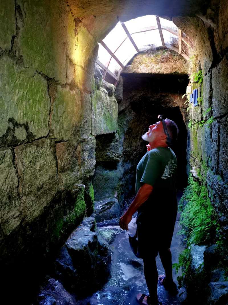אנו הולכים בקומה זקופה באמה החשוכה, פנסי הראש מאירים לנו את הדרך, והאת של מיקי מונפת ומפילה אבנים רופפות שמסכנות את ההולכים בה
