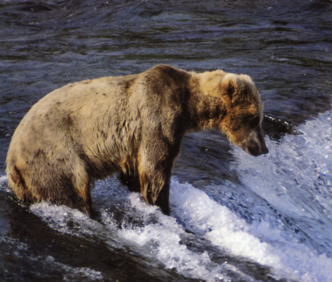 | דב גריזלי, היושב בראש מפל בשמורת קטמאי, מחכה לארוחת צהריים: דגי הסלמון הקופצים במעלה הזרם | צילום: אמיר יחיאלי |