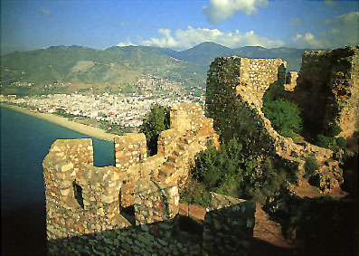 אלניה, 134 קילומטר מזרחית לאנטליה על כביש החוף, היא העיר הגדולה (כ-200,000 תושבים) הבאה. אלניה שימשה כעיר הנמל של האימפריה הסלג'וקית (כביש נוף יפה מספר 695 ששופץ ב-1997 על ידי התורכים מוביל לביישהיר ולקוניה, שש שעות של נסיעה ישירה). אלניה, כשאר ערי החוף הים-תיכוני התורכי, מתפתחת כעיר תיירות. האוטובוסים הבין-עירוניים עוצרים בכניסה לעיר.