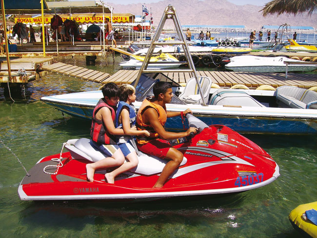 אם תגיעו לחוף נביעות, ליד מלון רויאל ביץ', תגלו כמה מזחים שמהם יוצאות הפעילויות הימיות של הסוכנויות פלמינגו, רויאל ספורט ימי, מצנחי הים האדום ואקסטרים ספורט ימי. בחוף, ליד כל מזח כזה, נמצא ביתן קטן שבו מסכמים את פרטי העסקה ומשלמים עבור התענוג. מניסיון אישי עשיר אני יכולה להעיד שהמחירים בכל המקומות דומים למדי, אפילו זהים. אחרי ניסיון דמוקרטי לחלק את כספנו בין המפעילים השונים גיליתי שמוטב לבחור מפעיל אחד ולדבוק בו. אחרי שנפרדתם מכמה מאות שקלים סביר להניח שבקנייה הבאה תקבלו יחס מועדף: טפיחות על השכם וקריאות "מה נשמע, גבר" לילדים, הנחות של כמה שקלים לאמא שלהם (שגם זכתה לכינוי הלא לגמרי מחמיא "אמא'לה").
