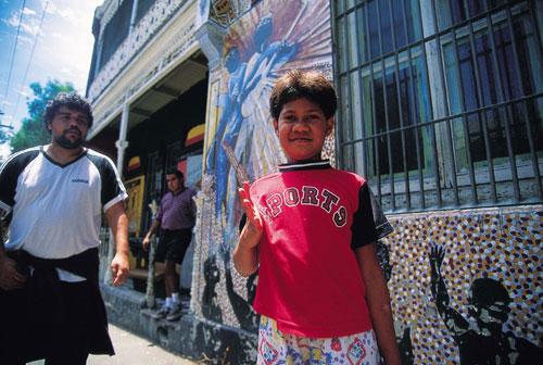 "אתה חייב לדבר עם מיסיס אינגרם", אמר לי כמעט כל מי שפגשתי ברדפרן (Redfern). ג'ויס אינגרם חיה כמעט כל שנותיה ברדפרן. בגיל 77, עם השכלה של שש כיתות בית ספר עממי נחות בלבד, היא בעלת מעמד יוצא דופן בקהילה האבוריג'ינית שבמקום. איש לא מדבר עליה כעל "ג'ויס", ואני חש באיזו משמעות מיוחדת לשימוש בתואר האלמנטרי כל כך – מיסיס, גברת – בצמוד לשמה. חיבה עזה וכבוד ללא מצרים של הדוברים. גילה ונסיון חייה, הוותק שלה בשכונה או חוכמתה, ואולי כל הדברים יחד, עשו אותה למנהיגה בקהילה, ל"זקנת שבט" (elder) של ממש, בנוסח המסורתי. בעיני רבים היא דוגמה להנהגה עממית, שונה מכל מיני מנהיגים בעיני עצמם ויומרניים של התנועה האבוריג'ינית. וכך, במשך כל ימי שהותי בסידני, אני מנסה לפגוש במיסיס אינגרם ולקבל גם ממנה תשובה לשאלה המציקה לי זה מכבר, ושאותה באתי לנסות לברר הפעם: מה המשמעות של קיום אבוריג'יני בעיר ובסביבה מודרנית, ומה הסיכוי לקיום כזה במאה ה־21 שבשער. "הבלוק" – כניסה לעולם אחר רובע רדפרן רחוק רק קילומטרים אחדים, עשר דקות נסיעה או שלוש תחנות רכבת, ממרכז סידני. זהו איזור מגורים אופייני של בני מעמד בינוני ופועלים בעיר הפנימית, מהדורה מרופטת של פדינגטון (Paddington) היוקרתי, עם שרשרות בתי קומתיים ששבכות ברזל אמנותיות בחלונותיהם ובמרפסותיהם. רובע שידע ימים טובים יותר, ושב, בחלקו, להיות  | | רוב המבקרים בסידני היפה והמטופחת אינם נחשפים לשכונה כמו רדפרן. עד מצעד המחאה הגדול של 60 אלף אבוריג'ינים בסידני ב-1988, לא הרבתה התקשורת העולמית לעסוק בנושא | צילום: מיכאל גלעדי |