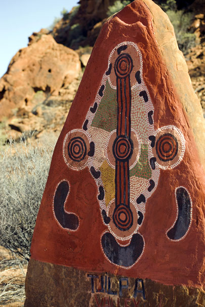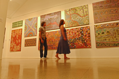 ציור כפעולה פוליטית האבוריג'ינים מאמינים שהעולם בו אנו חיים הינו חלק מישות גדולה יותר, שנשלטת על ידי יחסי גומלין עם האבות הקדמונים בעידן החלום. המושג קשור עם בריאת העולם על פי האמונה האבוריג'ינית, אך הוא מהווה גם כוח מניע רב עוצמה שמתקיים כאן ועכשיו. זהו מושג מפתח, שעל פיו נקבעים המערכת החברתית, הלכות הדת והיצירה. האמנות האבוריג'ינית, בעבר ובהווה, קשורה עם סיפורי עידן החלום והיא משמשת בטקסים שמיועדים לקשר בין בני האדם לבין כוחותיהם של האבות הקדמונים. אלו הם יצורים על טבעיים, המזכירים בצורתם חיות או צמחים שנבעו מהאדמה השטוחה והאפלה. כשהתעוררו מתרדמת הנצח שלהם, החלו לנוע בעולם, ובמסלולי נדודיהם בראו את הנופים ואת בני האדם, שהם יורשיהם הטבעיים. לאחר שסיימו את משימתם חזרו ושקעו באדמה במצב של תרדמה, אולם רוחם המשיכה להתקיים ביורשיהם. לפיכך, היצורים הקדמוניים – החולמים – הם בעלי נוכחות מתמדת, והאתרים שבראו הם מקומות מקודשים. סיפורי החלום מועברים מדור לדור באמצעות ציורים, סיפורים, שירה וריקודים. כך מתקיים רצף אינסופי בין האמנות של האבוריג'ינים בני זמננו לבין האמנות העתיקה. בניגוד לתפיסה המערבית, האמן האבוריג'יני אינו ממציא צורות או דימויים חדשים, אלא הוא יוצר במסגרת נוקשה של כללים, שמוכתבים לו על ידי מסורת עתיקת יומין. האמנות שלו נועדה להפיח חיים ברוחות הקדמוניות ולקדש את האתרים שבראו. בתשובה לשאלה מה משמעות ציוריו, משיב אמן אבוריג'יני, שהוא מצייר את הארץ שלו. אין אלה ציורי נוף במובן המקובל, שמתארים מראות מן הטבע, אלא מעין מפות של מסלולים, המסמנות באורח סמלי אתרים גיאוגרפים, שבעבר התרחשו בהם אירועים מיתולוגיים.  | | תערוכה של אמנות אבוריג'ינית בגלריה באליס ספרינגס | צילום: NT Tourism |