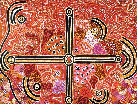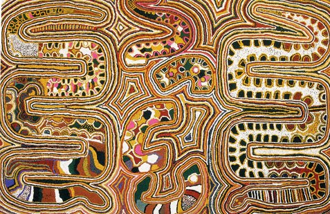 מייקל נלסון ג'קמארה, צייר אבוריג'יני המתגורר במושבה פאפוניה שבמרכז אוסטרליה, סיפר בראיון שנערך עמו לרגל תערוכת יחיד שלו: "סבא לימד אותי לצייר בחול, על הגוף ועל גבי מגינים עוד כשהייתי ילד קטן. כך התחלתי להשתתף בטקסים יחד עם סבי, דודי ואחי. אמא לימדה את אחיותיי ובנותיי אודות ציורי נשים וטקסיהם. אני תמיד מצייר כשילדיי מקיפים אותי. אני משוחח איתם ומספר להם אודות הארץ שלנו וכל מה שהתרחש בה. אני רוצה להנחיל להם את התרבות שלי. אני גאה ביצירתי ורוצה להציגה בפני אחרים, כדי שכולם ידעו מה עושים אמנים אבוריג'ינים". ב-1967 העניקה הממשלה האוסטרלית ל"מתיישבים הראשונים" שלה זכויות חוקיות מלאות, וכתוצאה מכך הם זכו באזרחות אוסטרלית וניתנה להם הרשות לצאת מתחומי ארצם, עובדה שאפשרה להם לראשונה להביא את תרבותם ואמנותה לתודעת העולם המערבי. באותה שנה נמצא בחבל ארנהם אחד הריכוזים הגדולים ביותר בעולם של ציורי סלע, וארכיאולוגים קבעו שהם בוצעו לפני יותר מ-20,000 שנה. קשה לקבוע תאריך מדויק, בין היתר, משום שמסורת ציורי הסלע נמשכת עד עצם היום הזה.  | | "נחש הקשת בענן", ציור של מיק גיל ג'אגאמארה משנת 1988 |