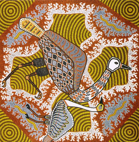 גלרוי יונופינגו מסביר מהם הכוחות שמניעים את האמנים האבורג'ינים: "כשאנחנו מציירים בזמן הטקסים – על גופנו, על קליפת עץ, או על בד – איננו עושים זאת לשם הנאה או תועלת. כשם שעשינו תמיד בעבר, אנו מציירים על מנת להוכיח את הקשר המתמשך עם הארץ שלנו, כולל הזכויות שלנו והחובות שלנו כלפיה. יתרה מזאת, אנו מציירים כדי להוכיח לעולם שאנו בעלי הארץ ושאנחנו הקניין שלה. הציור שלנו הוא פעולה פוליטית". ואכן ציור שמכיל את הסמלים המסורתיים יכול לשמש כיום כמסמך משפטי שמוכיח בעלות על הקרקע. בשפה האבורג'ינית רבת הדיאלקטים, שהיא שפה מדוברת בלבד, יש מונח אחד משותף למושגים הבאים: אדמה, ארץ, מחנה ובית ומשמעות כולם היא טריטוריה. אין מונח ייחודי לאמנות, כיוון שאין רואים בה פעילות עצמאית, אלא חלק ממערכות החיים. מפיצים את האמנות בעולם מוריס ג'ופורלה לותר נסע ב-1983 לפריס יחד עם 11 מחבריו, בני שבט הואלפירי, כדי לבצע ציור אדמה מסורתי, במסגרת התערוכה "מיבשת אחרת: אוסטרליה – חלום ומציאות", שהתקיימה במוזיאון לאמנות מודרנית. ב-1990 נבחרו שני אמנים אבורג'ינים לייצג את אוסטרליה בביאנלה בוונציה, עובדה שסימנה נקודת מפנה בהתייחסות לאמנות האבורג'ינית, שהוכרה כחלק מהיצירה העכשווית הבינלאומית בשנות התשעים. ב-1993 התקיימה בדיסלדורף שבגרמניה התערוכה הגדולה ביותר עד כה של אמנות אבורג'ינית. התערוכה זכתה לכותרת "השליח – אמנות האוסטרלים הראשונים". המונח "שליח" שנכתב בהיגוי אבורג'יני (ARATJARA) מבטא את הצורך העז שחשים כיום האבורג'ינים להפיץ את אמנותם בעולם כולו. אמנות אבורג'ינית מוצגת כיום גם בגלריות מסחריות ברחבי העולם והיא נמכרת במחירים שעולים ללא הרף. ביצירות העכשוויות חסרה ה"פאטינה" (ציפוי) שכיסתה את האובייקטים והציורים ששימשו לצרכי פולחן בעבר. האמן העכשווי אינו משתמש עוד בחומרים ובצבעים טבעיים ויצירתו רחוקה מלהיות אנונימית. האבורג'ינים אמנם אינם נוהגים לחתום על ציוריהם, אולם מאחורי כל ציור ניצב אמן אינדבידואלי. האמנות העכשווית משקפת את הדינמיות והרב-גוניות של החברה בה היא נוצרת.  | | "חלום תרנגול ערבת השיחים", 1989, ציור של מאתיו ג'ופורולה גיל. תרנגול ערבת השיחים המופיע בציור הוא אביו הרוחני הקדמון של הצייר |