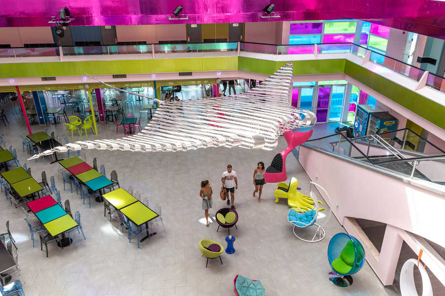 הלאונג' באברהם הוסטל אילת. מעל הפריטים המעוצבים והצבעוניים מרחף פסל תלוי ענקי של מנטה ריי | צילום: מאיה מימוני