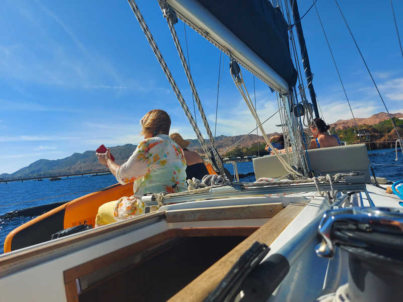 אם תשאלו אותי, דבר לא משתווה לשייט רגוע בסירת מפרש בים האדום, אנטיתזה לסירות המנוע המהירות שמשאירות מאחור שובל של קצף לבן לפני שהן נעלמות ברעש גדול. אני אוהבת את הים האדום, את ההרים האדמדמים שנושקים לו, את הרוח שמכה במפרשים ומבדרת את השיער. השקט מתפוגג לפתע כשאנחנו מבחינים בקצה זנב של דולפין (דולפינה, ליתר דיוק) ואז מופיע גב קעור ומיד אחריו שני ראשים צצים לרגע מעל המים ונעלמים במעמקים. קריאות ההתרגשות שלנו הן שמפרות את השקט, ולאחריהן שוב רגוע ונעים. עכשיו מגיע הזמן לרדת בסולם הקטן היישר אל תוך המים הקרירים. אמצע נובמבר ואנחנו שוחות סביב הסירה בים שמימיו לא קרים מדי גם בעונה הזאת. מי היה מאמין!