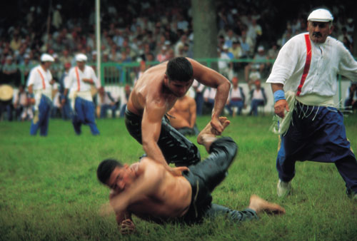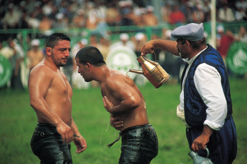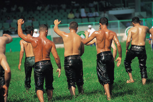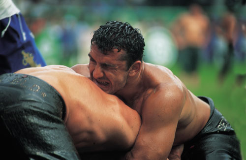ספורט של עניים היום השלישי של התחרות. תחרויות האלופים יתחילו רק אחר הצהריים, ובינתיים מתקיימת מכירה פומבית. על הפרק עומדת כבשה. הנדון: בחירת שר הטקס של השנה הבאה. בעבר היה שר הטקס מזמין את המתאבקים, מארגן את המשחקים, דואג לאורחים, מארח את הצופים ומספק מזון ולינה. אבל עם השנים הכריע עומס התפקיד שר טקס אחר שר טקס. לכן השתנה התפקידוהיה לייצוגי בלבד. כיום שר הטקס פותח את הטקסים, מעניק את הפרסים ומסתובב במהלך ימי התחרות מאוד גאה. הזוכה בתפקיד הוא מי שמציע את המחיר הגבוה ביותר עבור הכבשה במכירה פומבית סמלית. רוחות שינוי נושבות בתורכיה, העומדת על סף כניסה לשוק האירופי המשותף. כך למשל השנה, לראשונה ב־641 שנות התחרות, שר הטקס שנבחר לשנה הבאה הוא אשה בהירת שיער בחליפת עסקים הדורה. היא משלמת 6,000 דולר עבור הכבשה, שאחרי המכירה נותרת עזובה ליד המדרגות. כיום כבר עושים לאלופים בדיקת סמים, וכיום האלופים זוכים בכסף ולא בגמל, פר או סוס כמו בעבר. רוחות השינוי פועלות גם בכיוון אחר. לפני התחרות הנוכחית נודע לחברי הוועדה המארגנת שמתארגנות קבוצות של גייז תורכים מאיסטנבול, שבאים לצפות בגברים המתחככים והמשוחים בשמן לא מטעמים של צפייה ספורטיבית גרידא. הגורמים האיסלאמיים השמרניים יותר בוועדה תבעו לאסור על המתאבקים להכניס את ידיהם מתחת למכנסי היריב כדי לא ליצור רושם מוטעה. הצעתם נפסלה. האלופים עולים למגרש. ארבעים האלופים מנופפים בידיהם, מתחממים, מנפחים את חזם, מתייצבים בשורה בצדו האחד של המגרש. נגינת הזורנה והתופים הופכת אקסטטית. הרגע הגדול הגיע, והוא גדוש מטרים של שרירים משורגים, ליטרים של שמן זית ורבבת צופים משולהבים. טאשי מפסיד בנקודות. הקהל יוצא מכליו. טאשי לא מוותר. הוא צועק על השופטים. התחרות מופסקת. השופטים יוצאים מתאם כדי לפייס את טאשי, 104 קילוגרם של עצבים רוטטים. מצלמות הטלוויזיה של המגרש נזעקות להקיף את טאשי. השופטים אמנם יראים מכעסו של האלוף, אך הוא לא יזכה בשלו. השנה הוא לא יהיה אלוף האלופים.