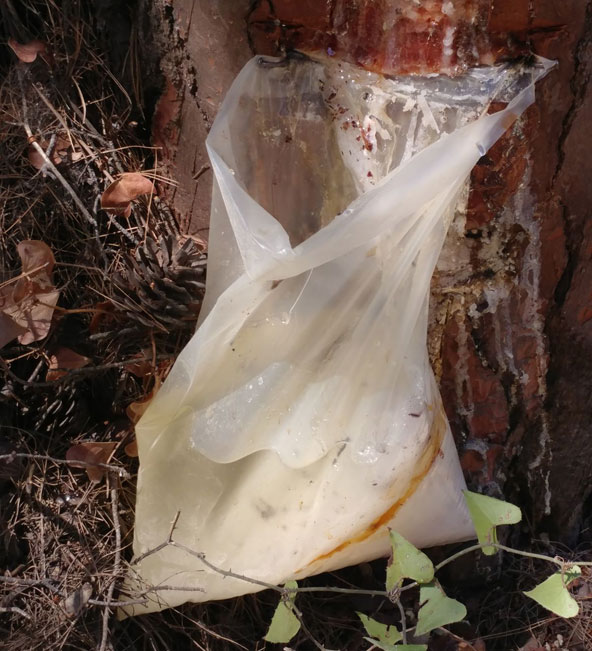 שקית לאיסוף רצינה תלויה על גזע של עץ אורן | צילום 'כן ולא'