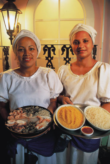 הכל מתחיל באורז לבן ושעועית שחורה. התבשיל הפשוט, פז'ואדה קומפלטה (Feijoada Completa) שמו, הוא המנה הבסיסית ביותר בריו ובברזיל כולה, המאכל הלאומי. לעתים מגישים אותו גם עם נתחי בשר אדום, ותמיד אפשר למצוא אותו על שולחנם של בני כל המעמדות. הם אוכלים אותו לפחות פעם ביום, לעתים קרובות פעמיים. כמו לחם. בברזיל, כמו ברוב המקומות בעצם, אפשר לגלות היסטוריה שלמה דרך שולחן האוכל: את האורז הלבן של הפז'ואדה, למשל, ייבאו לאמריקה הדרומית הספרדים, ואחר כך הוא אומץ בחום על ידי הפורטוגלים. אלה נחתו בחופי ברזיל במאה ה־16, והשפעתם ניכרת מאז במטבח המקומי (שלא כמו ברוב ארצות אמריקה הדרומית, כשישים אחוז מאוכלוסיית ברזיל הם ממוצא אירופי, ורובם מפורטוגל). הפורטוגלים שהגיעו לברזיל הביאו עימם מסורות שונות של בישול, תיבול וקינוחים מהבית, ולא שכחו את היין: עד היום מושרות מנות בשר רבות קודם בישולן ביין אדום. הפורטוגלים לא הגיעו לארץ ריקה. חיו בה אינדיאנים, תושביה המקוריים של ברזיל ושל אמריקה כולה. מסורת האוכל של האינדיאנים שומרת על הטעמים הטבעיים של מיני המזון, ללא תיבול. ההשפעה החשובה השלישית מגיעה מאפריקה ומכונה "המטבח של באהייה" (Cozinha Baiana), על שמה של מדינת באהייה במזרח ברזיל, שבחופיה הורדו מהספינות ראשוני העבדים השחורים (על שלושת הגזעים הללו נוספו מהגרים איטלקים, צרפתים, יפנים ואחרים, שתרמו מסורות קולינריות עשירות אשר הפכו לחלק מהתפריט המקומי). המטבח האפריקאי הביא איתו לברזיל את השימוש בחלב קוקוס, כוסברה טרייה, שרימפס ופירות ים אחרים מיובשים, פלפלים מתוקים וחריפים, שקדים ובוטנים טחונים. לשמן דֶנְדֶה – המופק מדקל אפריקאי – יש חלק חשוב בארוחה. הברזילאים מתייחסים אליו כמו אל תרופת פלא, שאולי רק מרק העוף היהודי עולה עליה בסגולותיו. כך התערבבו להם השחור, הלבן והאדום, ולא רק בצלחת הפז'ואדה קומפלטה. הקמח שעושה את הארוחה בברזיל גדלים כמה זנים של שעועית, אך המועדפת היא השעועית הקטנה והשחורה. בעת הבישול מועכים חלק מהשעועית עם שומן, בצל קצוץ ושום, ואת העיסה המתקבלת מערבבים עם יתר השעועית המתבשלת בסיר. את האורז שלהם מעדיפים הברזילאים כשהוא מתובל מאוד: קודם כל מטגנים אותו במחבת, מתבלים, ורק אז מוסיפים את נוזל הבישול – מים, תרכיז מרק או חלב קוקוס. את קמח המאניוֹק מפזרים על השעועית הלחה והוא זה שמוסיף לדעתם את הטעם הסופי, האולטימטיבי.