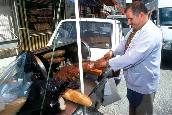 המאכל התורכי הנפוץ ביותר הוא השווארמה. כאן קוראים לה דוֹנֵר קֶבַּב, כלומר קבב מסתובב, והיא הרבה יותר טעימה מהשווארמה שלנו, בעיקר הודות לכך שאינה כשרה. יש דונר של כבש ויש של עוף, יש בלחמנייה, ויש בפיתה או בלאפה. קָבוּרְמָה הוא בשר כבש קצוץ דק, מתובל ומטוגן על פלטה לוהטת – ארוחה משביעה בתוך חצי כיכר לחם. נוֹהוּט־פִּילאַב הוא מאכל המכיל אורז מעורב עם גרגרי חומוס ובשר עוף, הנמכר מ"עגלת אקווריום" – למי שמעדיף ארוחה בקערית פלסטיק.