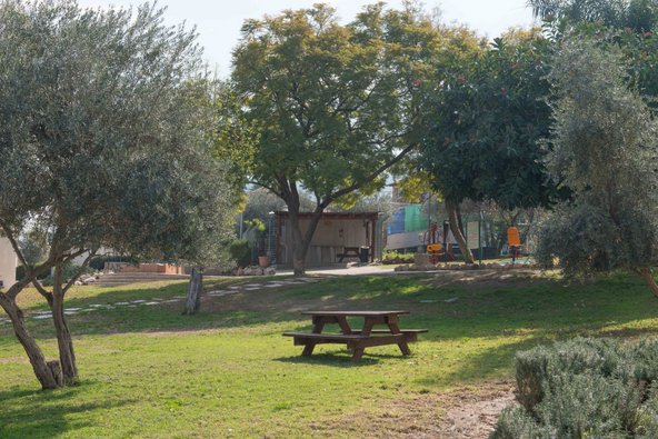 אכסניית אנ"א מעיין חרוד מוקפת בצמחייה ומדשאות ירוקות