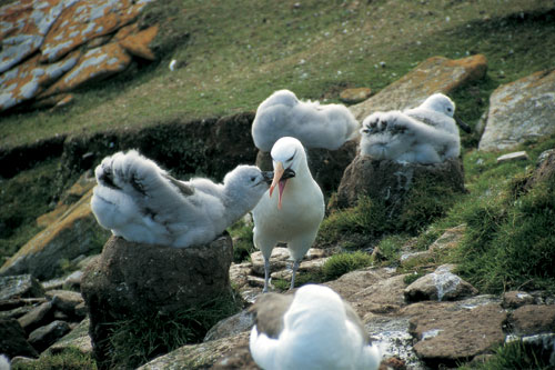 | אלבטורס שחור גבה מאכיל את גוזלו. ההורה שחזר מן הים פותח את מקורו האדיר, מצליב אותו עם זה של הגוזל ומקיא לו דייסת דגים מעוכלת למחצה | צילום : דנדן בולוטין |
