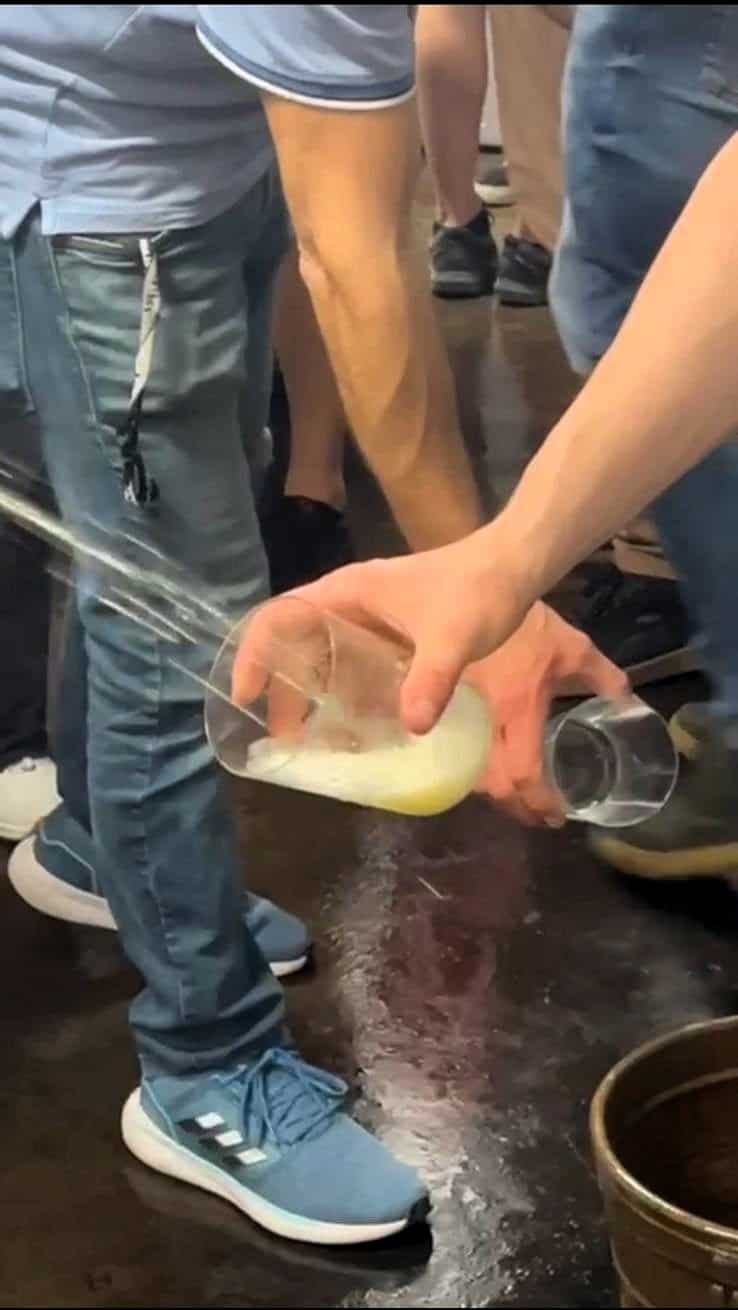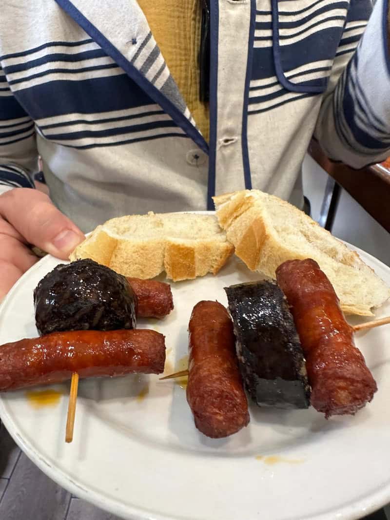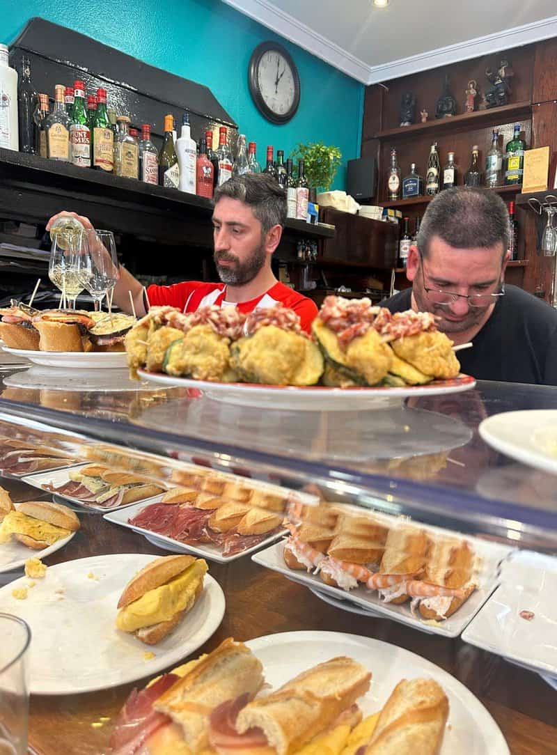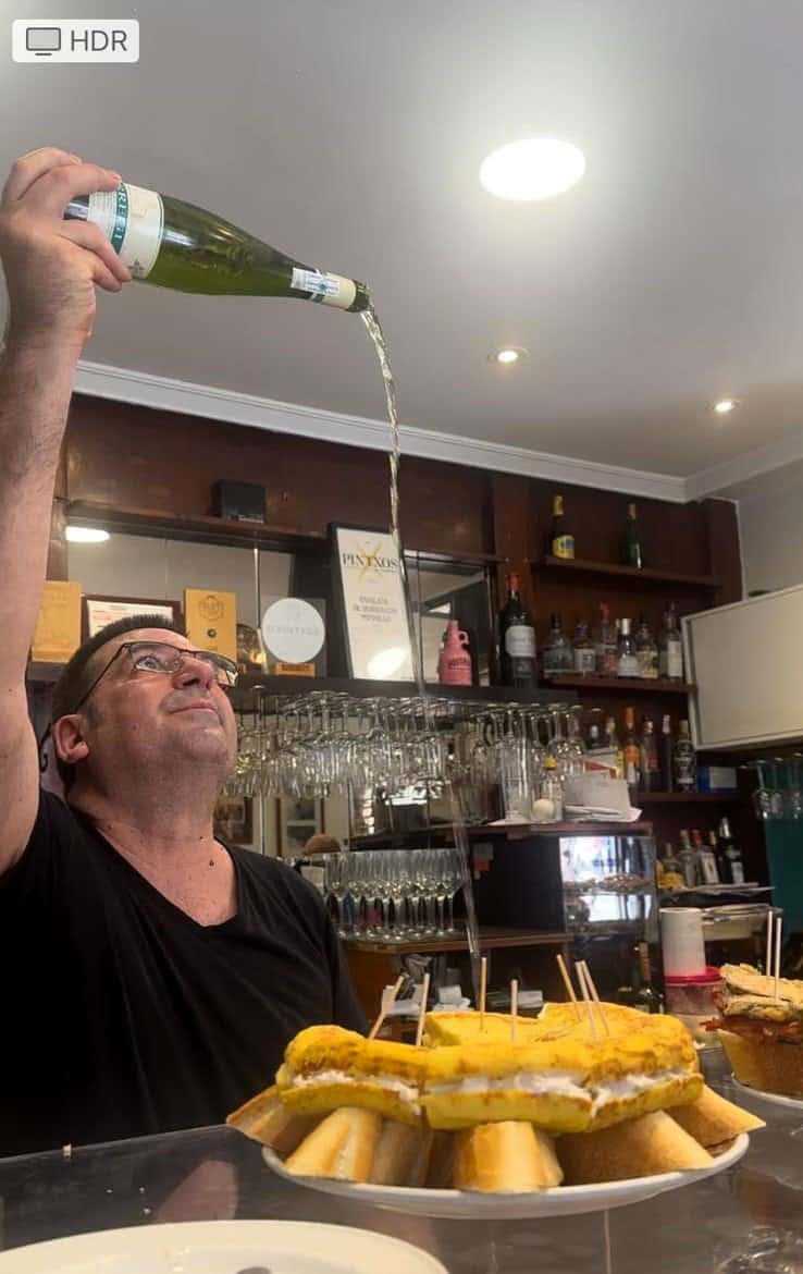 מול שוק האוכל אצל GORRITI TABERNA גרגורי מזמין לנו כוס צ'אקולי (Txakoli), היין הכי פופולרי בברים של דונוסטיה. השתייה מתחילה בטקס מזיגה מסורתי שאין לדלג עליו כשהברמן שמאחורי הדלפק מוציא מהמקרר בקבוק יין לבן צונן מאד (10 מעלות) שולף את פקק המתכת (רוב הצ'אקולי לא מיושנים בחביות עץ) אוחז בבקבוק ומניף גבוה ובמיומנות, ללא קשר עין בין הבקבוק לכוס הוא קולע והיין נמזג לכוס. "בדרכו לכוס", מסביר גרגורי, "במפגש של הנוזל עם החמצן באוויר משתחררות ארומות וטעמים. יין הצ'אקולי התוסס קלות בעל אחוז אלכוהול נמוך מיוצר מזני ענבים שגדלים באזור גטריה (Getaria), כפר דייגים סמוך, מופק מזן ענבים לבן (HONDARRABI) התוסס קלות שגדל בעיקר באזור גטאריה (לאחרונה התרחב הגידול עד סמוך לבילבאו) סוד הפופולריות שלו בברים ובמסעדות טמון בטעמו הקליל והפירותי עם נגיעה חמצמצה ואחוז אלכוהול נמוך שמשתלבת מצוין עם תפריט הפינצ'וס. טופה! TOPA (לחיים). תפריט היינות בברים בעיקר מיקבים מקומיים ומגישים גם סיידר, בירה וורמוט. בבר הזה, על הרצפה מתחת לרגליים מושלכים מפיות וקיסמים, פעם זה היה מדד להצלחה אבל היום בעלי הברים מנסים לבטל את התופעה.