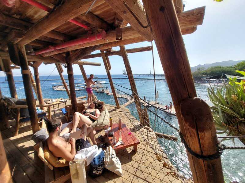 החוף המטופח והיפהפה הזה טובל בצמחיה אקזוטית ומשובץ בפינות חמד, מרבצי זולה, ערסלים ונדנדות הפזורים בין העצים וכסאות ישיבה עם שמשיות העומדים לרשות המבקרים על החוף, סמוך לקו המים. בין כל אלו משוטטים תרנגולים וטווסים, שמוסיפים לתחושת החופש המוחלט, אולם אין ספק כי הכוכבים הבלתי מעורערים של המקום הם הדולפינים. קריאות נרגשות מלוות כל גיחה שלהם מהמים, וכאלו היו בזמן שהותנו למכביר. הם כנראה יודעים כבר מזמן שהם הדוגמנים המבוקשים מכולם, ומרבים להתקרב ולהשתעשע בקפיצות לולייניות לגבהים, שבכל פעם מחדש מרגשות וסוחטות קריאות התפעלות מיושבי החוף, מהמשתכשכים במים ומאלו שבוחרים לשבת על המזחים הצפים על פני הים כדי לצפות בכל תנועה שלהם ממש ממרחק נגיעה. המעוניינים יכולים לקחת את החוויה הבלתי נשכחת הזו עוד צעד קדימה, ולהצטרף (בתוספת תשלום) לשחייה או צלילה עם הדולפינים במים.