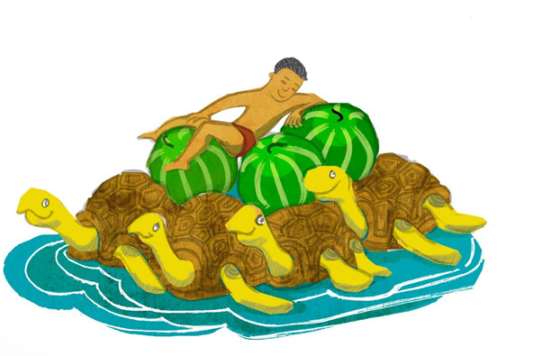 "רעיון משוגע", אמר אלכסנדר הצב הרך ועיניו הקטנות הבריקו: "אני אוהב רעיונות משוגעים, יש בך משהו מאלכסנדר!" והוא צווח את צוויחת הצבים הרכים ומכל הסלעים העגולים החליקו צבים לתוך המים הבוציים ויצרו משטח של שִריונות. איסכנדר גלגל עליהם את האבטיחים והתיישב על הערימה וכולם הפליגו אל הים.