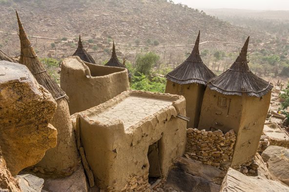 כפר של הדוגון במאלי. גגות הקש המחודדים מזכירים כובע של מכשפה