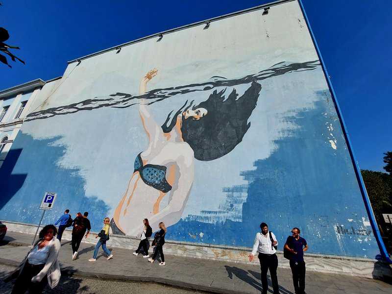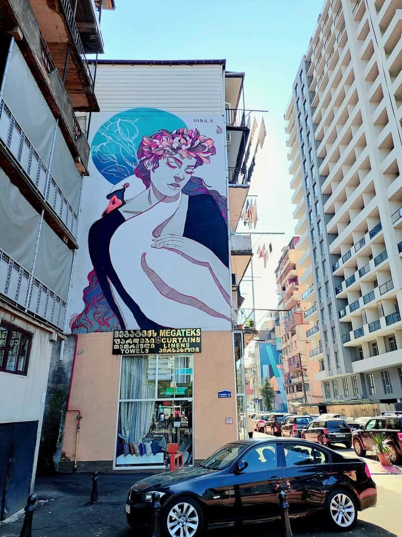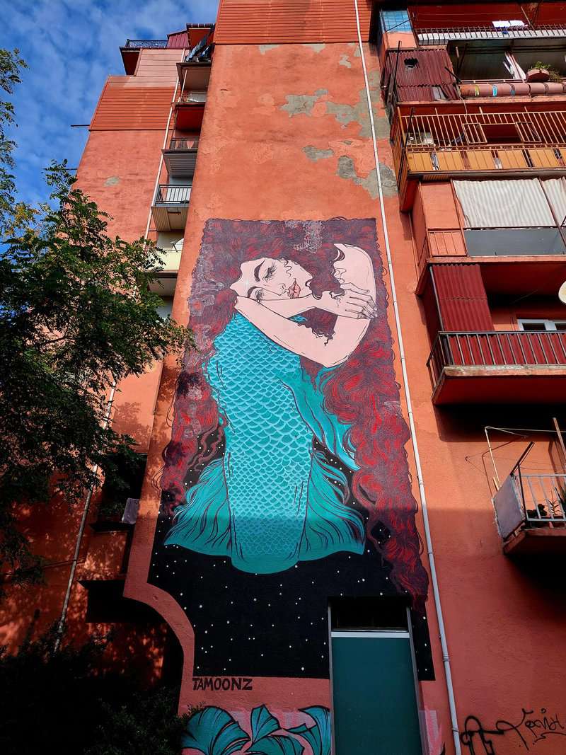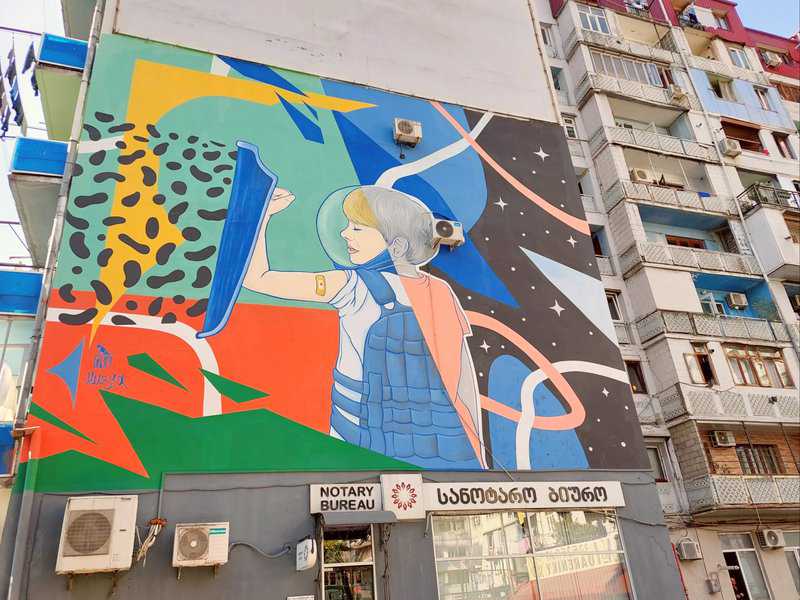 אבל לא רק נושאים הרי גורל. ב"ניקו" רצו לעשות משהו גם לגבי קירות המבנים הסובייטיים המכוערים שברית המועצות הורישה לגיאורגיה בשנות שליטתה במדינה. האמנית Tamoonz, בוגרת האקדמיה לאמנויות של טביליסי ומשתייכת גם היא ל-Niko Movement, עשתה בדיוק את זה על קיר בניין המגורים ברחוב Gamsakhurdia מס' 1. הציור שלה, כמו רבים מציורי הרחוב של בטומי, מהדהד את נופה הימי של העיר. בת הים שלה, כמו דמויות נשיות אחרות של טאמונז, מצטיינת בשיער אדום שופע, שבציור הזה משתלב יפה בקיר האדום של הבניין. www.tamoonz.com