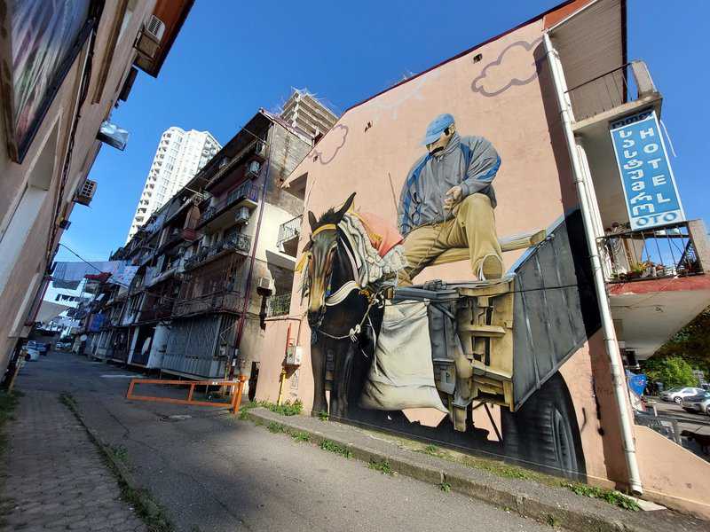 אחד מציורי הקיר האהובים ביותר של בטומי נמצא על הקיר המערבי של מלון Oto ברחוב Pirosmani מס' 8. זהו "העגלון" של האמן הגרמני Matthias Mross, שמייצג, כמו רוב הדמויות בציורים הריאליסטיים המרשימים שלו, תערובת של העולם הישן והחדש – הפרד שלו רתום ל-Uremi, עגלת העץ ששימשה להובלת נוסעים ולצרכי חקלאות בימים עברו, אבל הוא לבוש באופנת פנאי עכשווית וכובע עם לוגו של אדידס. מרוס, שמשתייך גם הוא לתנועת "ניקו", מצייר קאובויז עירוניים בשכונות עוני ורוכבים בטרנינג על כבישי אספלט, זרים לנוף האורבני שהם שתולים בו. מרוס מרבה לנסוע בעולם ואת השראתו הוא שואב מדיירי שכונות, הומלסים ורוכלים ברחובותיהן של ערים גדולות. matthias-mross.de