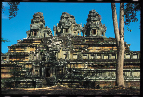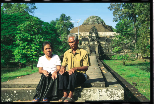 תהום השכחה קמבודיה, קמפוצ'יה, חמר, אנגקור – כולם שמות הקשורים לתרבות אחת שנודעה בארכיטקטורה ובאמנות שלה. שמה של העיר, אנגקור, מטעה לעיתים, שכן בזיכרון המערבי הוא נקשר במקדש אחד: אנגקור וואט. אבל אנגקור היא עיר של מקדשים וארמונות, המשתרעת על כ־310 קילומטרים רבועים, ומכילה יותר מאלף מבנים. רבים מהם נהרסו, את האחרים כיסה היער. אבל 39 המבנים שאפשר עדיין לראות מהווים מכלול יוצא דופן ומלהיב, שגם הצילומים הרבים אינם חושפים את הפאר האמיתי שלו. "הנה כאן נמצאים אותם מקדשים שבמשך זמן כה ארוך נדמו כחזיונות… כאן נמצאים היסודות, הגלריות, הכרכובים, כיפות הדום יוצאות הדופן, הנדמות לעטרות רבות טבעות", כתב החוקר הצרפתי קלוד פרר ב־1931. משנת 802 ועד 1432 לספירה היתה אנגקור מרכז האימפריה החמרית, שבמרכזה הארמון אנגקור טום. בשיאה, במאות ה־11 וה־12, השתרעה האימפריה על שטח שכלל את רוב שכנותיה: תאילנד, וייטנאם ולאוס. סופה בא עליה כשהצבאות התאיים פלשו לאנגקור הבירה ובזזו את אוצרותיה. אחרי פלישה זו הועברה הבירה החמרית לפנום פן, ולמעט תקופת פריחה קצרה נוספת במאה ה־16 נבלעו המקדשים והארמונות ביער הטרופי ושקעו בתהום השכחה. זו לא היתה שכחה מוחלטת; אבל המערב לא גילה עניין באנגקור, למרות שנוסעים וסוחרים מסין, יפאן, ספרד ופורטוגל  | זוג קמבודי בחזית מקדש באפאון, צפונית לבאיון. רק שרידים מעטים נותרו ממקדש זה, ומייחד אותו שביל הכניסה המוגבה |