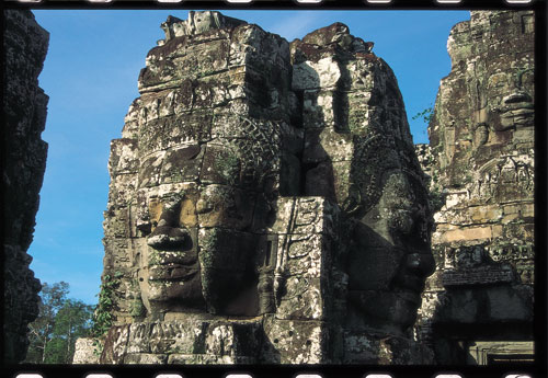 סוד הקסם מהו סוד הגדולה של אנגקור? ייתכן כי הוא מצוי בצירוף של הארכיטקטורה, האמנות והתפיסה הקוסמולוגית העולה מהיחסים בין הבניינים. הארכיטקטורה של המקדשים החמריים והעיטורים על הקירות עוצבו על פי סדרה של אמונות מאגיות ודתיות. לפי אחת האמונות, המלך ועיר הבירה נמצאים במרכז היקום. אמונה אחרת גורסת שהמעבר מהעולם החילוני אל העולם הקדוש נעשה באמצעות ארבעה צירים, כיווני רוחות השמים, המובילים מהשוליים אל המרכז. הרעיון הארכיטקטוני והדתי ההודי (ההינדואי והבודהיסטי כאחד), שהמקדש הוא מיקרוקוסמוס של ההר מרו הקדוש, מקום מושב האלים, משמש רעיון מרכזי בתרבות החמרית, והיתה לו השפעה עמוקה על אמנותה של תרבות זו. במהלך ההתפתחות הארכיטקטונית נוצרו שני אלמנטים נוספים: החומה והחפיר. שביל האבן המקשר בין המקדשים מייצג את הגשר שבין עולם האדם לעולם האלים. חזיתם של מרבית המקדשים פונה מזרחה. המזרח מייצג את החיים ואת הכוח היוצר של  | | 196 ראשי ענק מעטרים את מקדש הבאיון. חלק מן החוקרים טוענים שהחזזיות המכסות רבים מן הקירות משמרות את האתר והסרתן עלולה לפגוע במקדשים |