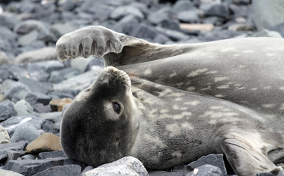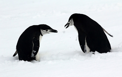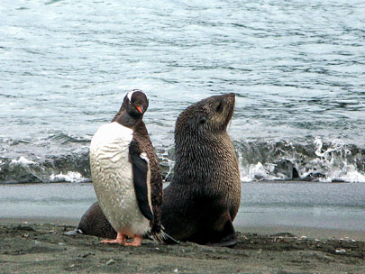 אנו מטפסים אל להקה של פינגוויני פס הסנטר. חלקם דוגרים, אחרים קוראים לבן הזוג להחלפת משמרת. הגוזלים מציצים מתחת להורה התורן ומיד בורחים חזרה פנימה מפני הקור. על סלע גדול מעלינו שחף דגר על שלושה גוזלים, שומר עליהם לא רק מחמסנים אלא גם מבני מינו. בצדו השני של המיצר, בוססנו שעה ארוכה בשלג עד שהגענו לקבוצה של כלבי ים מסוג וודל, שלמרבה האירוניה נקראים כך על שמו של צייד כלבי ים. שמונה או תשעה כלבי ים שכבו בשלג באפס מעשה. בים הם מהירים וחזקים, ביבשה הם עצלים ורובצים במקומם. מעת לעת אחד מהם התמתח, נפנף בסנפיריו, מתח את צווארו וחזר לנמנם.