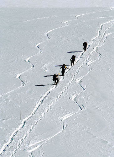 החשכה, אבל אחר הצהריים כיסו עננים את השמים וגשם זלעפות התחיל לרדת. הגשם הפך במהרה לברד ואז לשלג, שלא חדל לרדת כל הלילה. הטמפרטורה ירדה לחמש מעלות צלזיוס מתחת לאפס, ולנו לא היו שקי שינה ומזרנים. הסופה שבאה בהמשך הביאה אותנו להחלטה שצריך לוותר. >>>