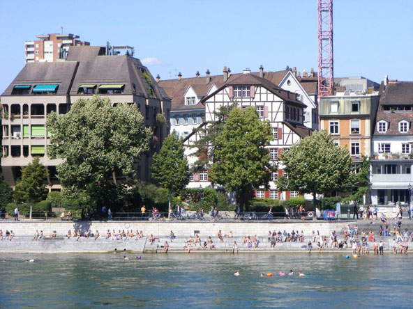 ומשהו שאין לו שום קשר לאמנות. במי הריין החוצה את העיר, כבר צצים בעונת היריד ראשוני המתרחצים. הם בולטים לעין בזכות האופן שבו טובלים הבזלאים בנהר שלהם – אוחזים בשקיות כתומות צפות, אטומות למים, שבהן מאוכסנים הבגדים, ומניחים לזרם המהיר של הריין לסחוף אותם. צריך רק לדעת מתי ואיפה לחתוך כדי לעלות אל הגדה. חוויה בזלאית למבינים! .jpg) שחייה בריין, חוויה בזלאית למביני דבר | צילום: רוני ערן