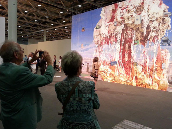 מוקד משיכה מרכזי ביריד של השנה שעברה היה מתחם המיצגים "14 חדרים", שבו הוזמנו 14 אמנים בינלאומיים, בהם סלבס כמו יוקו אונו ודמיאן הרסט, ליצור מיצג אישי, כל אחד בחדר משלו. הפרובוקציה שזכתה לכיסוי רחב במדיה המקומית היתה מילו מוייר, אמנית מיצג מדיסלדורף, שהסתובבה בעירום מלא ברחובות בזל, כשעל אבריה כתובים בשחור שמות הבגדים שהיו אמורים לכסות אותם. " לצעוד עירומה ברחובות בזל זו אמנות?" תהה עמודו הראשון של היומון המקומי. כמחצית מהמבקרים בארט בזל מתבוננים ביצירות בעיניים, כל השאר – דרך מסך הסמרטפון | צילום: רוני ערן