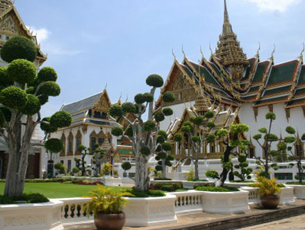 | ארמון המלך בבנגקוק – Grand Palace ממלכת תאילנד היא מונרכיה חוקתית והתאילנדים מעריצים את מלכם, פומיפון אדוניאדט (Bhumibol Adulyadej) המכונה ראמה ה-9, שדיוקנו מתנוסס כמעט בכל פינה בבנגקוק. הקומפלקס הגדול של הארמון ומקדשיו נמצא בליבה של העיר ומתאפיין בפאר שרק מלכים יכולים להרשות לעצמם. מלך תאילנד כבר לא גר בארמון הזה אלא בארמון המגורים שבצפון העיר. הגרנד פאלאס משמש היום לצרכים טקסיים בלבד. הארמון גובל בצלעו הדרומית בוואט פהו (מקדשו של הבודהה השוכב) והכניסה אליו היא מהצלע הצפונית. לארמון המלך, הנחלק למתחם המקדשים ולמתחם מבני הטקסים, יש להגיע בלבוש צנוע ולא – תישלחו לשכור מכנסיים/חצאית בחנויות שבכניסה. מקופת הכרטיסים מובילה הדרך אל הכניסה לאזור המקדשים – כמאה מבנים שנבנו על ידי המלכים השונים. אי אפשר שלא להתפעל מהצבעים הבוהקים, מהמקדשים העצומים, ומהפסלים הגדולים. כדאי לשוטט כאן בנחת, גם אם לעתים זו משימה לא קלה בשל גדודי התיירים שפוקדים את הארמון בכל יום. המקדש הקדוש ביותר, לא רק בקומפלקס הזה או בבנגקוק אלא במדינה כולה, הוא מקדשו של בודהא האיזמרגד, פְהרָה קֶוו (Phra Kaew), שמשמש קמע של הממלכה התאילנדית. מוצאו של הפסל (העשוי מחתיכה אחת של אבן ירקן בגודל של כשבעים סנטימטר) לא ידוע. הוא עבר נדודים בצפון תאילנד, הגיע ללאוס ובסוף מצא את משכנו הקבוע במקדשי הארמון. לפסל שלוש גלימות זהב המותאמות לעונות השנה בתאילנד: לעונה הגשומה, לעונה הקרירה ולעונה החמה. שלוש פעמים בשנה מטפס המלך אל הכן הגבוה שעליו ניצב הפסל, ומחליף את לבושו. אסור לצלם את הפסל, לפני שנכנסים אל המקדש יש לחלוץ נעליים ובפנים אסור לעמוד. מאזור המקדשים ממשיכים אל מתחם מבני הטקסים דרך פתח בצלע הדרומית. הבניין המרשים ביותר בחלק זה הוא ארמון צ'אקרי הגדול. אפשר להיכנס לאולם קבלת הפנים המפואר ולהתרשם מהסגנון האירופאי שלו. הארמון לא משמש למגורי המלך מאז מותו המסתורי של המלך ראמה ה-8 (אחיו של המלך הנוכחי) שנמצא באולם הזה לאחר שנורה למוות בשנת 1946. מצפון לארמון המלך נמצאת הכיכר המלכותית סאנאם לואנג (Sanam Luang), שבימים מיוחדים עורכים בה טקסים ואירועים מלכותיים וממלכתיים, ובסתם ימי חול וחג היא משמשת את הקהל הרחב. שעות פתיחה: מדי יום 8:30-15:30. אינטרנט