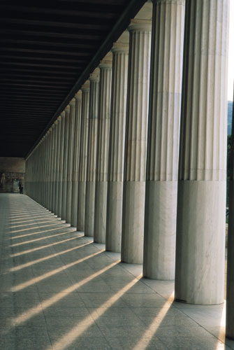 האקרופוליס כפרוזאק אתונה נשענת על שרידי עבר מפואר, למרגלות גבעת האקרופוליס. לא חשוב עד כמה היא תלך לאיבוד בתזזיתיות הנוירוטית שלה, כמעט מכל מקום אפשר פשוט להרים את הראש, לאתר את שרידי הפרתנון – מקדש האלה אתנה, שעל שמה קרויה העיר – ולהירגע. כי במובן מסוים, המבנה ההרמוני הזה, פאר קר של שיש חשוף, מתפקד כסוג של פרוזאק מנטלי. כדור הרגעה, משכך חרדות. משרה תחושת ביטחון, יציבות. מאשֵר את הנצח. אם  | הסטואה של אטלוס באגורה העתיקה. אכסדרת העמודים שבנה המלך אטלוס השני מפרגמון במאה השנייה לפני הספירה שימשה מקום מפגש פופולרי לעשירי אתונה. לפני כחמישים שנה שוחזרה הסטואה בצורה אותנטית, מלבד השינוי בצבע: במקור היו עמודי השיש צבועים באדום ובכחול |