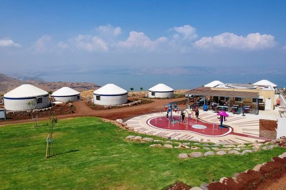 מתחם היורטים ממוקם ממש על קצה המצוק מעל הכנרת, בלי שום דבר שחוסם את הנוף, שהוא מהיפים בארץ. התצפית הזו יכולה להתחרות בכבוד (וגם לנצח) בנקודות תצפית מפורסמות על הכנרת כמו מצפה אופיר או מצפה השלום. את הנוף אפשר לראות משולחן האוכל המשפחתי שצמוד לכל יורט (ובו אכלנו את ארוחת הערב מול שקיעה שאין מנוס מלתארה בקלישאות כמו עוצרת נשימה). אם האוהל נמצא בשורה הראשונה, אפשר לפתוח את הדלת והחלונות ולהשקיף על הכנרת היישר מהמיטה.