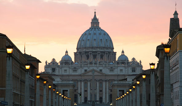 בזיליקת פטרוס הקדוש, ותיקן הוותיקן, המדינה העצמאית הקטנה ביותר בעולם, שמשתרעת על פחות ממחצית הקמ"ר בליבה של העיר רומא, היא מקום מושבו של הכס הקדוש ושל האפיפיור ומרכז הנצרות הקתולית בעולם. בוותיקן חיים רק 800 אנשים, אבל מדי שנה מבקרים בה למעלה מארבעה מיליון אנשים, רבים מהם עולי רגל קתולים, אבל התיירים שמגיעים להתרשם מהאסתטיקה ומאוצרות האמנות של המקום מהווים חלק משמעותי לא פחות. המבנה המרכזי בוותיקן הוא בזיליקת פטרוס הקדוש, הכנסייה הגדולה בעולם, וגם אחד האתרים המקודשים ביותר לנצרות. לפי המסורת, בבזיליקה קבור פטרוס הקדוש שהיה אחד משניים עשר השליחים של ישו וגם הבישוף הראשון של רומא, שהיה הראשון בשושלת האפיפיורית.  בזיליקת פטרוס הקדוש בשעת בין ערביים. הכנסייה הגדולה בעולם ומרכז הנצרות הקתולית
