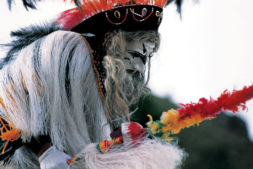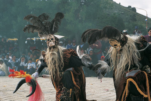 ערכו חזרות למחזות המתארים את מלחמת האור בחושך, מלחמת הים ביבשה, מלחמת אלת האדמה באל המִכרות. בערב הראשון נשפכה הבירה כמים, והשותים עשו כאותם בני איימרה קדומים, אשר נהגו לשפוך מעט מיין התירס הקדוש לאדמה, כי הלגימה הראשונה שייכת תמיד לפאצ'אמאמה – אם כל חי, אלת האדמה שמתוכה הכל קם והיה, כי גם האלים נולדו בתוכה. חגיגות הבתולה מקַנְדֵלָרִיָה, גלגול של מיתוסים מהאיזור בחג טהרה קתולי, נערכות מדי חודש פברואר בשני היישובים שלחופי ימת טיטיקקה (Titicaca). כאן, ליד האגם, התבססו עוד לפני תרבות האינקה מלכויות שבט האיימרה, שזכו לעושר רב בזכות מקנה הלָמָה והאַלפָקָה, והמשיכו להחזיק בעושרן ובמידה רבה של עצמאות גם בימים שבהם שלטו באיזור מלכי האינקה, שבירתם היתה קוּסקוֹ (Cuzco). כל תרבויות האנדים התייחסו ביראת כבוד מיוחדת לכתם הכחול הזה בתוך שלל צבעי האדמה – הגבוהה שבימות העולם, 3,812 מטר מעל פני הים, 6,900 מטרים מרובעים שטחה, ועומקה המירבי – 263 מטר. אוניות שטות באגם הלוך ושוב ומקשרות בין פרו ובוליביה, דייגים מוצאים בתוכו שלל דגים מבורך, ובחופיו – למרות הגובה הרב, המאפשר במקומות אחרים גידול תפוחי אדמה בלבד – מגדלים אפילו תירס. זו ימת מים מתוקים מרשימה, סגורה בין הרים, הנראית כשייכת למקום אחר, כאילו זה עתה השאיר הים הגדול חלק מתוק מעצמו בתוככי היבשה. אין פלא, אם כך, שלמתגורר באיזור קשה לקבל שאגם כזה הוא תופעה טבעית. מיתוסי בראשית סופרו כאן ומיתוסים נוצרים ומסופרים כאן בכל יום, כי הם נולדים מחדש מדי יום. האל וירַקוֹצָ'ה, בורא העולם והאנשים, נולד כאן; השמש עצמו, האל אִינְטִי, נוצר באי השמש, סלע קדוש בתוך האגם, כשהוא מוקף מים וערפל; הלבנה התעוררה משנתה בתוך מימי הימה באי הנקרא על שמה; וגם העמים והשבטים של איזור האנדים, בהם משפחת מלכי האינקה, נוצרו על ידי האל באחד מהאיים הרבים. בתודעה המקומית ימת טיטיקקה היא רחם העולם, ממנה נולד הכל. כרחם קשורה הימה בטבורה לאם הגדולה, לפאצ'אמאמה, שבה הכל נובט ובה הכל שוקע, זו שברחמה חיים ומתים, זו שמאכילה חיים ומתים גם יחד. לכן צריך להזין אותה: בגופה קוברים מאכלים, עובּרי למה, דברי מתיקה, ובטקסים שונים מלקקים את הנוזל ששפכו בין האבנים, כדי שהמלקקים יהיו כתינוקות היונקים משד אמם. זו גם הסיבה לכך שלא יעלה על דעתו של בן שבט הקצ'ואה או האיימרה לשתות מיין התירס הקדוש, הצִ'יצָ'ה, לפני ששפך לאמא אדמה משהו מהנוזל.  | יותר משישים להקות מתחרות זו בזו ומבצעות ריקודים קדומים, שרק חגיגה זו משמרת אותם |