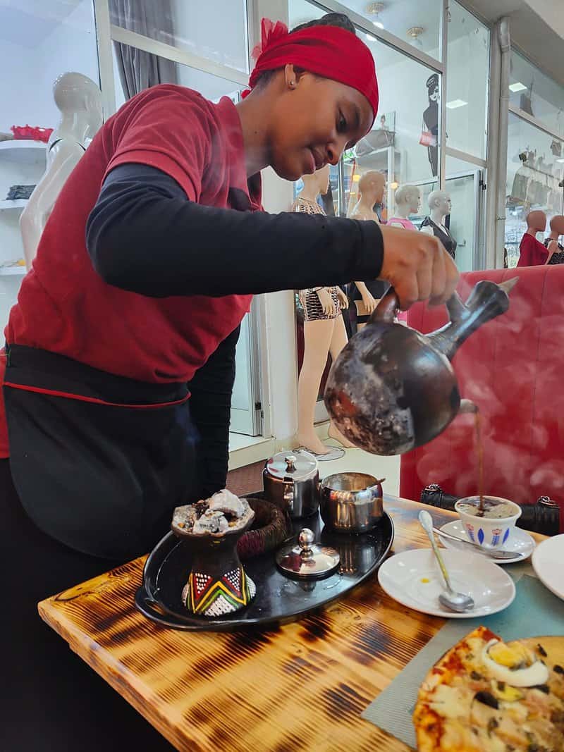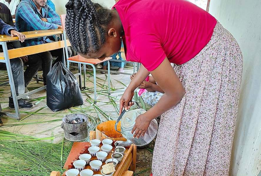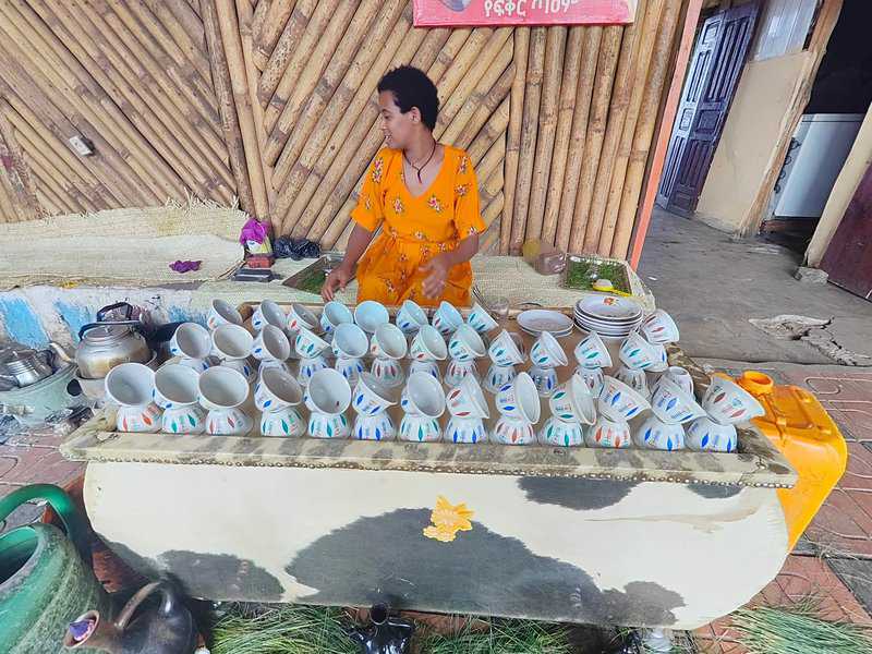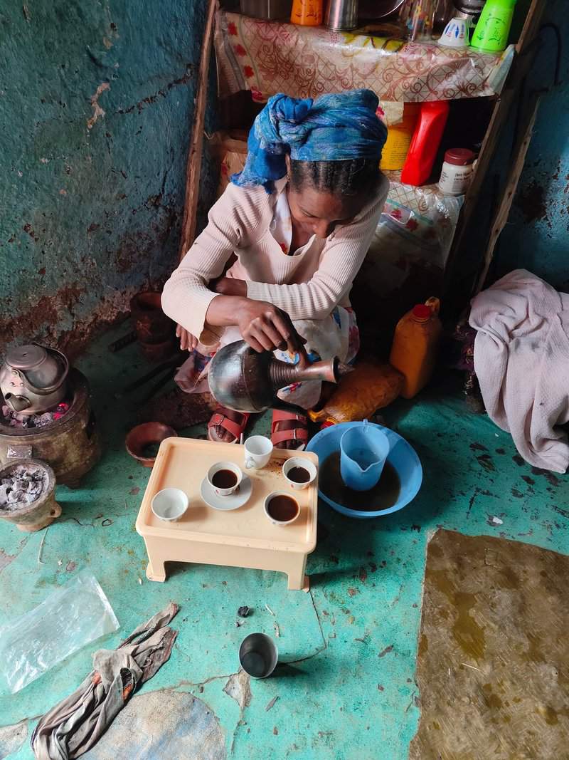 טקס קפה אתיופי תמיד נופל בחלקה של אישה צעירה. המארחת המיומנת הזו לובשת שמלת כותנה לבנה מסורתית הרקומה בחוטים צבעוניים. תנועותיה המיומנות מרוממות את הפעולה הפשוטה יחסית של קלייה, כתישה, בישול ומזיגת קפה לרמה של אמנות. ילדים רבים עדים לטקס הקפה כמעט כל יום – ועד שלוש פעמים ביום.