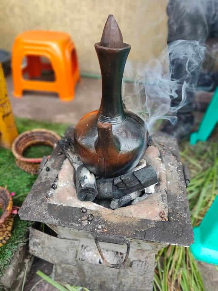 זרעי קפה גולמיים נשטפים בכדי להסיר את קליפתם ואחר כך קולים אותם עד שהם מתכהים ובורקים. או אז המארחת מסלקת את פולי הקפה מהאש ומנופפת במחבת כדי ליצור אווירה ארומטית.