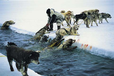 | | כלבים באי באפין, קנדה, במהלך ניסיון עיקש לחצות תעלה של מים קפואים |