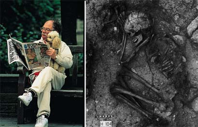 | | מימין: אתר קבורה בן 12,000 שנים, השייך לתרבות הנאטופית, ששרידיה התגלו בישראל. לצידו של האדם הקבור, בחלקו השמאלי העליון של הצילום, נמצא שלד של כלבלב, או זאב; משמאל: הכלב היה החיה הראשונה שבויתה וכיום הוא אחד מבעלי החיים המבויתים השכיחים ביותר | צילום: טל גליק |