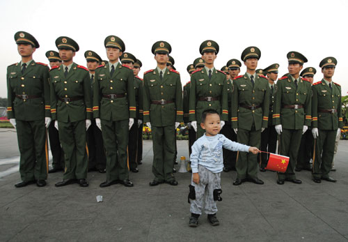 עיר מלוכה הטבעת הפנימית מקיפה את כיכר טיינאנמן גואנג צ'אנג (Tian an men Guang chang), הכיכר הגדולה בעולם, טבורה של העיר. לצדם של המבנים הקיסריים עומדים בכיכר מבנים שמקרינים את נוכחות המשטר הקומוניסטי רב העוצמה. מולם נהגו סטודנטים להפגין נגד השלטונות, וב-1989 נהרגו כאן מאות מהם במהלך דיכוי הפגנה אלים במיוחד. לא רחוק ממבנים אלה ניצבים סימני הקִדמה המעידים על הדרך החדשנית שאליה שמה סין את פניה: התיאטרון שתכנן האדריכל הצרפתי פול אנדרה והמוזיאון החדש שואו דוּ בּוֹ ווּ גואן סין גואן (Shou du Bo wu guan Xin guan, המוזיאון של הבירה) שאינו אלא מעטפת מודרנית לאוסף ענקי של אמנות סינית היסטורית.
