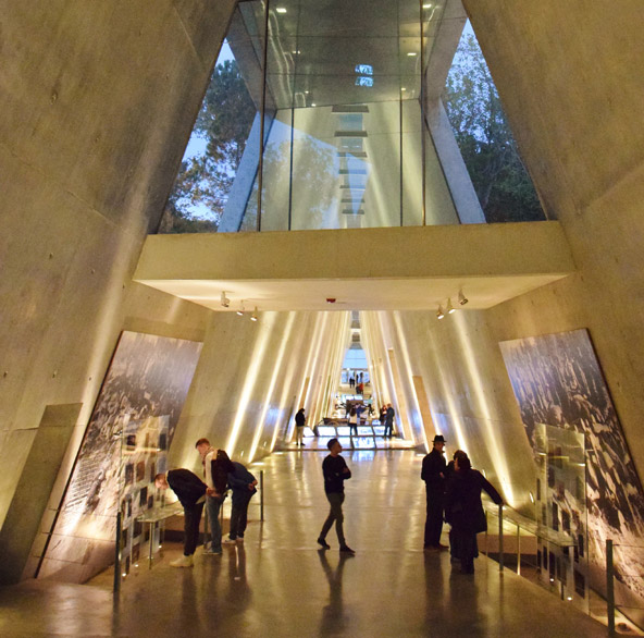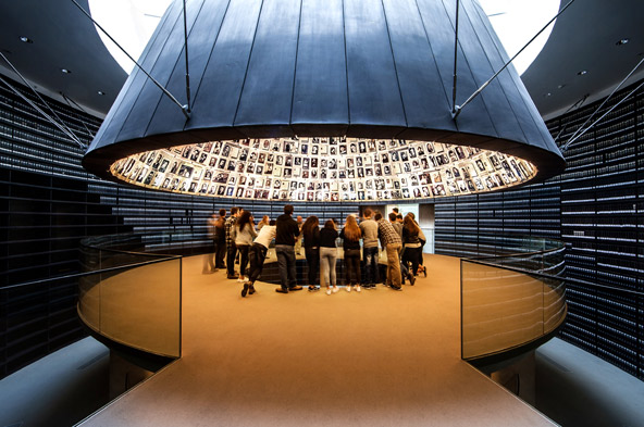 המוזיאון בנוי ברובו מתחת לפני הקרקע והוא בעל מבנה לינארי דמוי חץ – 200 מטר אורכו – החודר להר מצדו האחד ויוצא מצדו האחר. המוזיאון מורכב מגלריות שונות, המציגות את סיפור השואה מנקודת מבט יהודית ייחודית על ידי חפצים מקוריים, מסמכים, עדויות, סרטים, יומנים, מכתבים ויצירות אמנות גם יחד, תוך שימת דגש על הסיפור האישי והאנושי. השילוב של כל אמצעי הביטוי האישיים הללו מאפשר למבקר לקלוט ולחוות את שפע המידע באמצעות חוויה חושית רב ממדית ומרגשת.