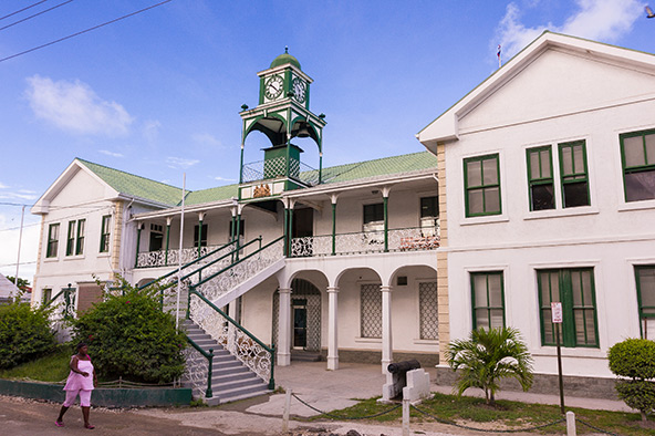 בליז סיטי. מבט כללי (למעלה) והמבנה הקולוניאלי של בית המשפט
