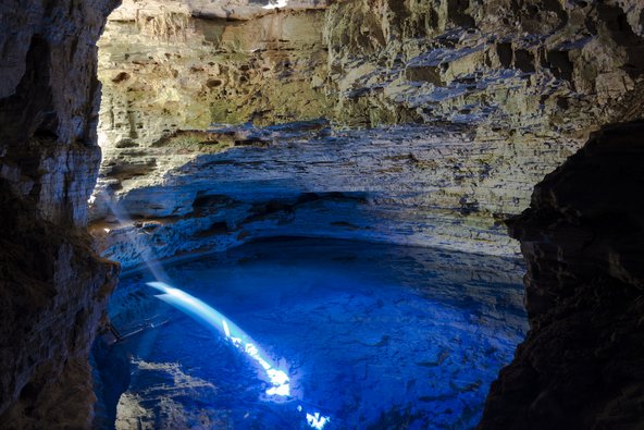 הנהר ואגן הניקוז שלו מספקים שלל חוויות מסעירות – סיורים ליליים למפגש עם החיות הליליות של הג'ונגל, טיולים רגליים, שייט, דיג של דגי פיראנה, סיורים רגליים בזריחה ועוד. העיר הגדולה באמזונס היא מנאוס, ובה נפגשים שני הנהרות הגדולים, האמזונס והריו נגרו, שגם הוא נחשב לאחד מן הנהרות האדירים בעולם. קשה לטייל באמזונס באופן עצמאי, ומומלץ להגיע עם חברת טיולים. לרוב חברות הטיולים מציעות חבילות הכוללות לינה על בסיס פנסיון מלא באחד הלודג'ים שביער וטיולים באזור. מומלץ להתמקם על הריו נגרו, שם יש לודג'ים ברמה טובה ומגוון מוקדי עניין – מפגש עם דולפינים ורודים, שמורות קופים ואפשרות למפגש עם השבטים המקומיים. הפארק הלאומי צ'פאדאס דאס דיאמנטינס הפארק לאומי צ'פאדאס דאס דיאמנטינס (Parque Nacional da Chapada Diamantina) ששוכן במדינת באהיה הוא אחד מאתרי הטבע היפים באזור, למרות שהוא פחות מוכר בקרב מטיילים ישראלים. יש בו מגוון נופי רחב – צוקים תלולים, מערות, קניונים, מפלים ונהרות, וכן שפע של צמחייה. את שמו, Diamantinas, קיבל הפארק הודות ליהלומים שנמצאו בו במאה ה-19. בין האתרים המעניינים בפארק ניתן למנות את מפל Cachoeira da Fumaça שנופל מגובה 380 מטר ואת בריכת Poço Encantado (הבריכה הקסומה) אשר בין החודשים אפריל וספטמבר מימיה מקבלים צבע כחול מדהים. בפארק יש מסלולי הליכה רבים בדרגות קשי שונות וניתן לערוך בו טרקים.  הבריכה הקסומה בפארק הלאומי צ'פאדאס דאס דיאמנטינס